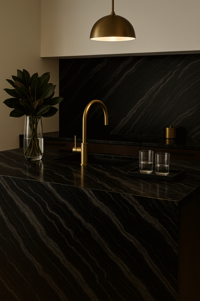 Black Galaxy granite features a deep black base adorned with golden and copper flecks that resemble a starry night sky. Highly durable and visually striking, it’s ideal for luxury kitchens, commercial counters, and premium architectural spaces seeking a bold, timeless statement with minimal maintenance and long-lasting shine.