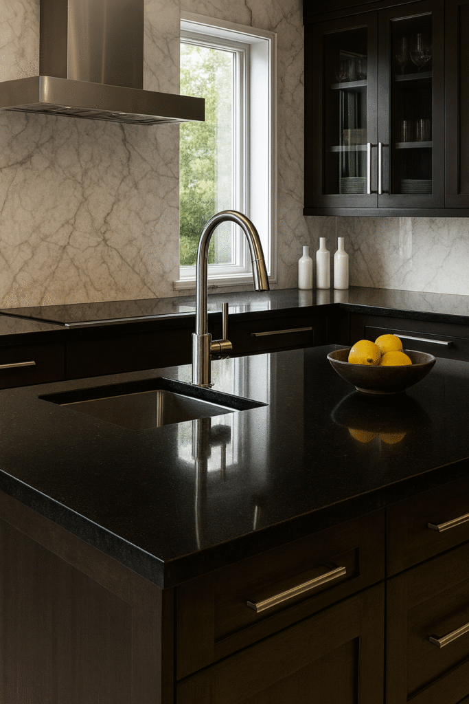Blue in the Night granite offers a deep black base illuminated by shimmering blue crystals that glow subtly under light. Its refined elegance suits luxury kitchens, bars, and premium commercial interiors. Extremely durable and visually captivating, it delivers sophistication while retaining the timeless strength of high-quality granite.