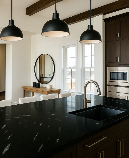 Majestic Black Lapatro granite is known for its textured finish and deep, velvety black appearance. Perfect for those seeking luxury with a tactile feel, it works well in kitchens, bathrooms, and feature walls. Its leathered surface provides anti-slip qualities, making it suitable for flooring while maintaining elegance and durability in both indoor and outdoor applications.