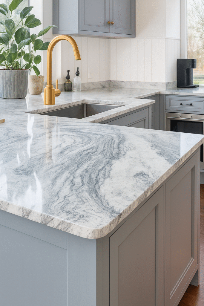 Viscount White granite features stunning wave-like patterns of black and grey on a white background, offering a marble-like aesthetic with granite’s robust durability. Ideal for countertops, vanities, and statement walls, it adds elegance and flow to interiors. Each slab is uniquely patterned, providing a refined yet dramatic visual effect.